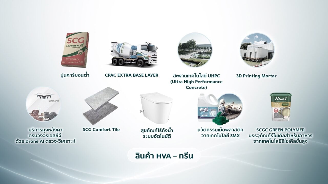 เร่งเพิ่มกำลังผลิตสินค้ากรีนและสินค้ามูลค่าเพิ่มสูง (High Value Added Products-HVA) อาทิ ปูนคาร์บอนต่ำ ปูนคาร์บอนต่ำ อยู่ระหว่างพัฒนาปูนคาร์บอนต่ำรุ่นใหม่ Generation 3 ที่ลดคาร์บอนไดออกไซด์ได้ถึง 38% โดยเตรียมปรับกำลังการผลิต 2 ล้านตัน/ปี ภายในปี 2570 ที่จ.สระบุรีและ CPAC Extra Base Layer นวัตกรรมซ่อม-สร้างถนนลดการยุบตัวและคงตัวทนนานจากการกัดเซาะน้ำ สะพาน UHPC (Ultra High Performance Concrete) สมรรถนะสูง ลดเวลาก่อสร้างได้ถึง 50% 3D Printing Mortar เทคโนโลยีการขึ้นรูปอาคารก่อสร้างที่มีดีไซน์ซับซ้อน ขยายตลาดไปญี่ปุ่น ซาอุดิอาระเบีย และมาเลเซีย ยกระดับ Roof Installation บริการมุงหลังคาครบวงจรเอสซีจี ด้วย Drone AI ตรวจรอยรั่วหลังคาและวิเคราะห์โครงสร้างแบบ 3 มิติ ช่วยให้ซ่อมแซมรวดเร็ว ปลอดภัย และแม่นยำยิ่งขึ้น SCG Comfort Tile กระเบื้องซีเมนต์ปูพื้นรายแรกในไทย ที่ลดความร้อนสะสมได้ 3–7°C ด้วย HeatSync Technology ให้พื้นเย็น เดินสบาย สุขภัณฑ์ไร้ถังประหยัดน้ำ DUACT และแบบ “เคลือบจากเปลือกไข่–หอย” ลดการปล่อยก๊าซเรือนกระจก นวัตกรรมเม็ดพลาสติกจากเทคโนโลยี SMX ช่วยลดความหนาของผลิตภัณฑ์ลงโดยยังคงความแข็งแรง พัฒนาเป็นสินค้าหลากหลาย เช่น ท่ออุตสาหกรรมเหมืองแร่ขนาดใหญ่ ฝาขวดน้ำอัดลม ถังบรรจุสารเคมี และบรรจุภัณฑ์สินค้าอุปโภคบริโภค นวัตกรรมพลาสติกรีไซเคิล ทั้งเทคโนโลยีรีไซเคิลเชิงกล และเทคโนโลยีรีไซเคิลขั้นสูง ซึ่งใช้ผลิตเป็นบรรจุภัณฑ์ Food Grade ปลอดภัย ผ่านการรับรองมาตรฐาน ISCC PLUS ครอบคลุมตลอดห่วงโซ่อุปทาน