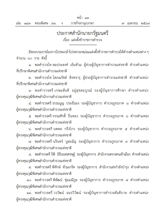 ราชกิจจานุเบกษา เผยแพร่ประกาศสํานักนายกรัฐมนตรี เรื่อง แต่งตั้งข้าราชการตํารวจ ให้ดํารงตําแหน่งต่างๆ จํานวน 60 นายวันนี้ (7 เม.ย.2569) เว็บไซต์ราชกิจจานุเบกษา ได้เผยแพร่ประกาศสํานักนายกรัฐมนตรี เรื่อง แต่งตั้งข้าราชการตํารวจ ความว่า