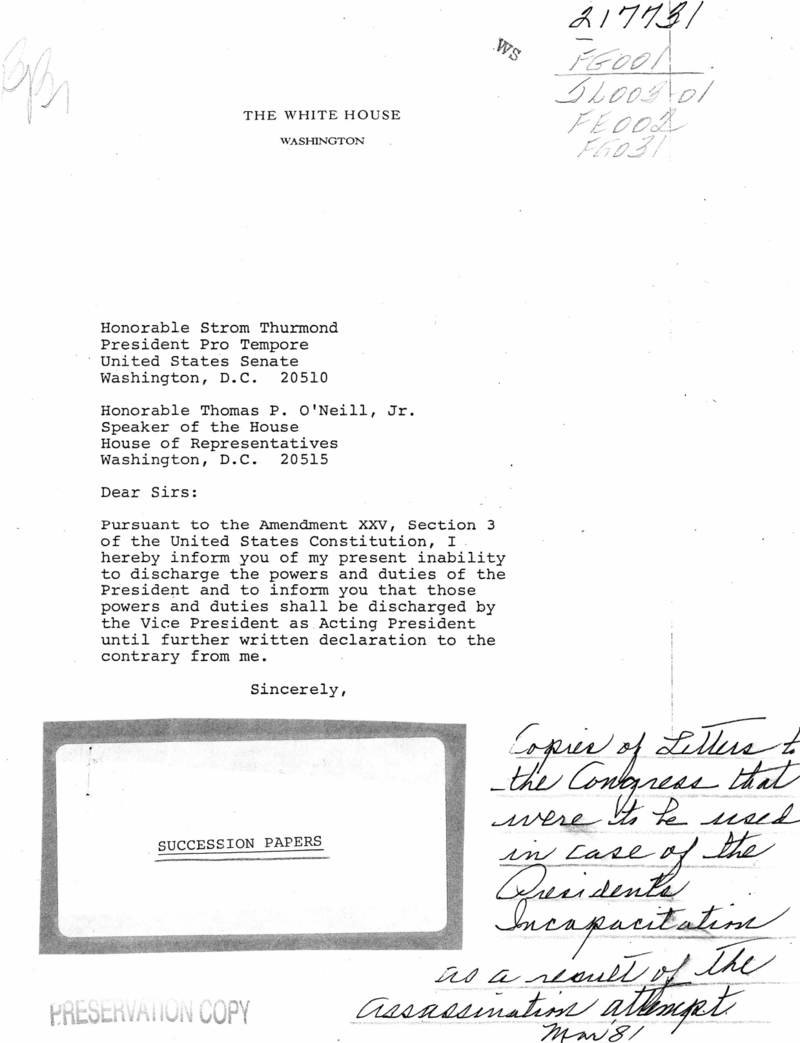 จดหมายแจ้งประธานสภา กรณี อดีต ปธน.เรแกน เข้ารับการรักษาในโรงพยาบาล